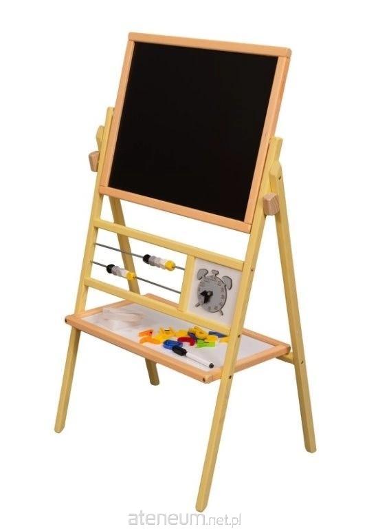 Obrotowa, kolorowa suchościeralno-kredowo-magnetyczna tablica z 2-rzędowym liczydłem. Zegar z ruchomymi wskazówkami. Gąbka, kreda, marker, literki magnetyczne w zestawie.