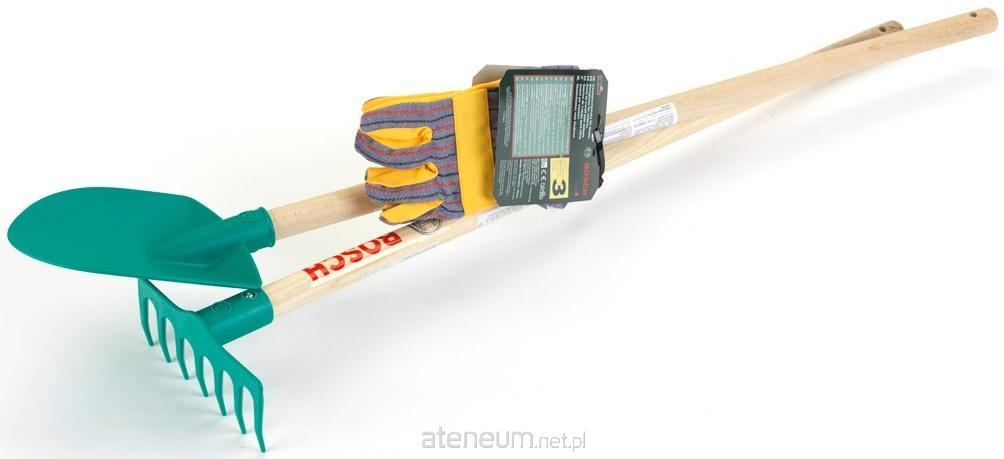 Zestaw dla małych fanów zabaw na zewnątrz i miłośników ogrodnictwa w modnym wzornictwie Bosch. W skład zestawu wchodzą łopata i grabie wyposażone w solidne trzonki z praktycznym uchem do zawieszenia narzędzi. W zestawie są także rękawice ogrodowe, które pasują na dzieci powyżej 3 roku życia. Rękawice sprawiają dużo radości, jednak jako zabawka nie oferują żadnej funkcji ochronnej. Grabie i łopata są w kolorze ciemnej zieleni. Narzędzie te mają wygodne trzonki wykonane z drewna z wykończeniem w naturalnym kolorze. Drewno trzonków jest wyczyszczone i wypolerowane, dzięki czemu zapewnia komfort trzymania, a także bezpieczeństwo. Narzędzia zestawu są lekkie, dzięki czemu dzieci bez problemu trzymają je w dłoniach. Pomaganie w pracach ogrodniczych stanowi nie tylko świetną zabawę, lecz także wspiera rozwój umiejętności motorycznych i myślenia przestrzennego oraz zachęca dzieci do ruchu na świeżym powietrzu.