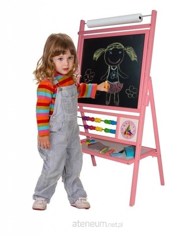 Obrotowa, RÓŻOWA, suchościeralno-kredowo-magnetyczna tablica z 2-rzędowym liczydłem i ROLKĄ papieru do rysowania, zegar z motywem księżniczki z ruchomymi wskazówkami. Wyposażona w gąbkę i kredę. Marker w zestawie.