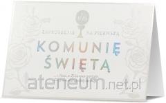 Elegancki karnet na Pierwszą Komunię Świętą w formacie B6 z laserowo wycinanym wzorem. Delikatny, ażurowy motyw z symbolami religijnymi, takimi jak hostia, krzyż czy gołąb. Wewnątrz miejsce na życzenia i dane uroczystości. Idealna pamiątka tego ważnego dnia.