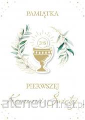 Książeczka z okazji I Komunii Świętej w formacie A5 wraz z kopertą w środku. Wyjątkowa książeczka upamiętniająca jeden z najważniejszych dni w życiu dziecka - Pierwszą Komunię Świętą. Elegancka i starannie wykonana pamiątka w formacie A5, ozdobiona złotymi detalami i delikatnymi ilustracjami nawiązującymi do sakramentu Eucharystii. Format: A5 (poręczny i elegancki), Kolorowe ilustracje w środku, które nadają całości wyjątkowego charakteru, Miejsce na osobiste wpisy - idealna do zachowania wspomnień z uroczystości, Koperta wewnątrz.