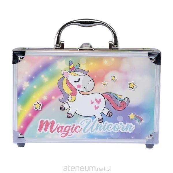 Walizka z motywem jednorożca zawiera bogaty i kolorowy zestaw do makijażu oraz stylizacji paznokci.
