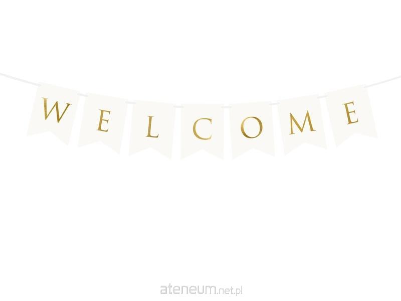 Baner w kolorze białym ze złotym napisem Welcome, do samodzielnego złożenia, zestaw zawiera literki i ok. 2,5 m białej tasiemki, wymiary po złożeniu: wysokość ok. 15 cm, długość ok. 95 cm.