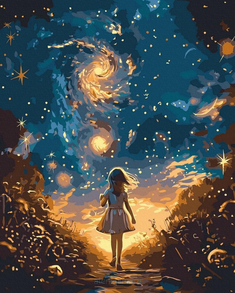 Zanurz się w magicznej opowieści o dziewczynce, która kroczy ku nieskończonemu wszechświatowi pełnemu gwiazd i galaktyk. Ten obraz wypełniony światłem i tajemnicą idealnie nada się na wieczorne relaksujące malowanie.