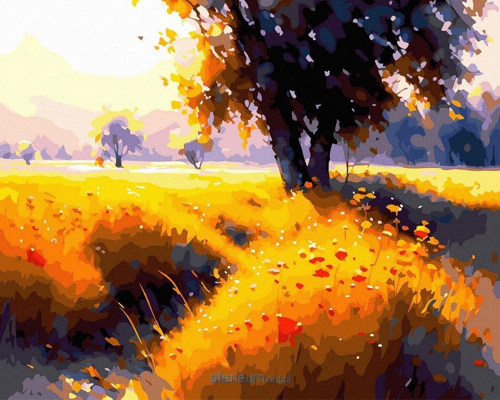 Pejzaż pełen słońca, złotych zbóż i spokojnego letniego światła. Malując ten obraz, poczujesz ciepło i harmonię przyrody.