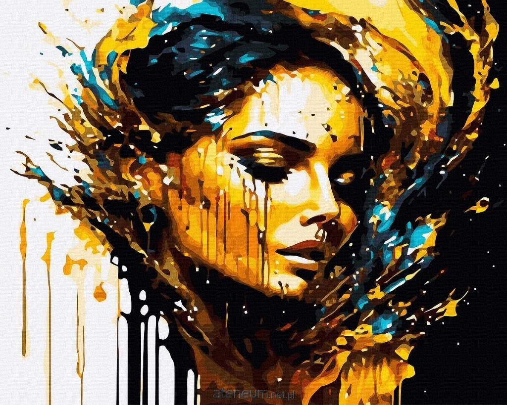 Portret kobiety z rozwianymi włosami, namalowanymi w intensywnych barwach złota, błękitu i brązu. Obraz pełen emocji i ekspresji dla tych, którzy kochają sztukę nowoczesną.