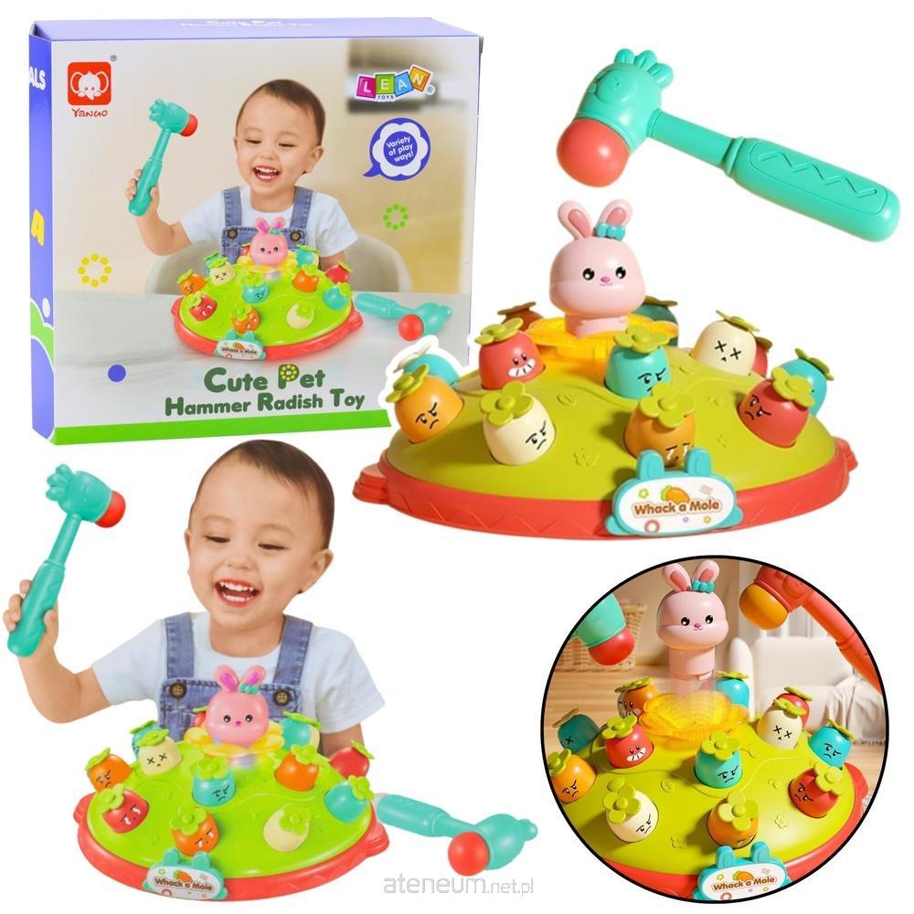 GRA ZRĘCZNOŚCIOWA UDERZ MŁOTKIEM W MARCHEWKĘ Zabawka "Uderz młotkiem" to idealna propozycja dla najmłodszych, którzy uwielbiają interaktywną zabawę pełną ruchu, dźwięków i kolorów. Na zielonej platformie przypominającej wesołą łąkę znajduje się 14 kolorowych marchewek o różnych mimikach oraz różowy króliczek, który staje się głównym bohaterem zabawy. Po włożeniu króliczka w środek platformy i przekręceniu go, rozpoczyna się zabawa - dziecko uderza bezpiecznym młoteczkiem z miękką końcówką w marchewki. Jedna z nich, w zależności od ustawienia króliczka, aktywuje mechanizm, który sprawia, że królik wyskakuje w górę, co wzbudza salwy śmiechu i zachwytu. Zabawie towarzyszy wesoła melodia, która przyciąga uwagę i motywuje do dalszej aktywności. To świetna forma rozrywki, która rozwija koordynację ruchową, precyzję, logiczne myślenie oraz pozwala dziecku rozładować emocje w zdrowy, radosny sposób. Po zakończonej zabawie młoteczek można wygodnie odłożyć do specjalnej dziurki na platformie. SPECYFIKACJA: Wymiary platformy: 26 cm x 9 cm Wymiary młotka: 17,5 cm x 8 cm x 4,5 cm Wymiary króliczka: 8,5 cm x 5 cm x 5,5 cm Wymiary opakowania: 26 x 24,5 x9,5cm Materiał: plastik, guma Zasilanie: 3 x 1.5V AA (brak w zestawie) ZAWARTOŚĆ ZESTAWU: Platforma z 14 marchewkami Różowy królik Młoteczek Oryginalne opakowanie