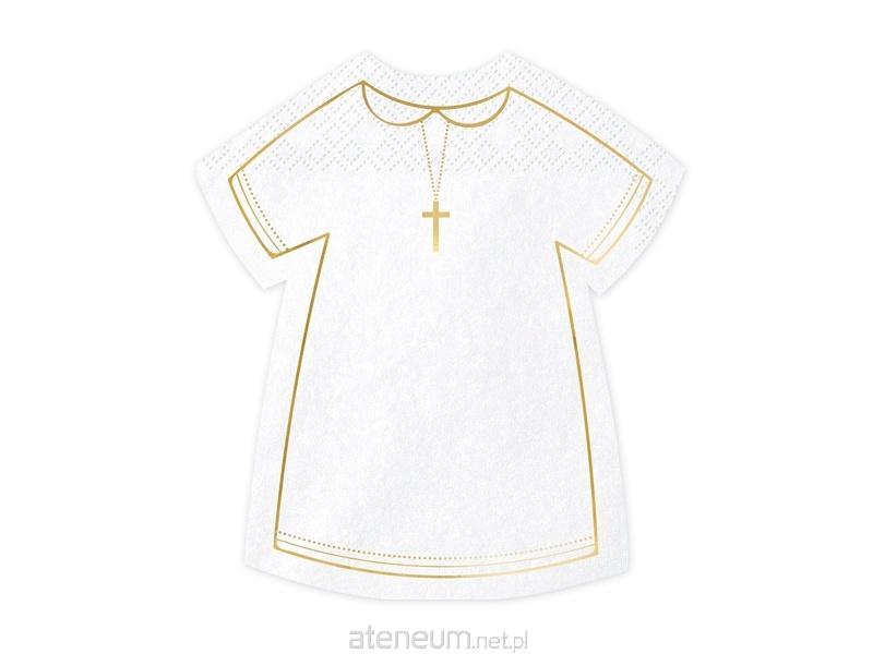 Serwetki papierowe w kształcie alby komunijnej w kolorze białym ze złotym metalizowanym nadrukiem, wymiary po rozłożeniu ok. 28 x 32 cm, wymiary po złożeniu ok. 14 x 16 cm.(1 op. / 20 szt.)