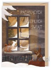 Otwierana kartka, pusta w środku, wykonana na papierze (z certyfikatem EFC) z wyraźnie widoczną fakturą. W zestawie ekologiczna koperta.