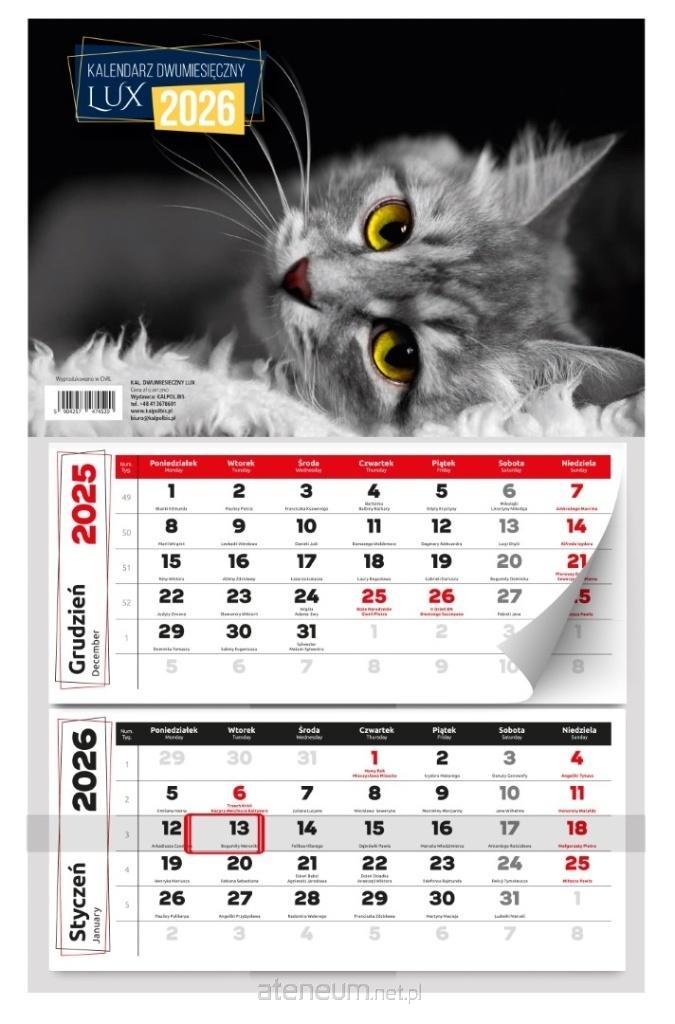 Kalendarz ścienny, dwumiesięczny z okienkiem; 12 kart. Główki wypukłe 2 wzory. Wymiary po rozłożeniu 295x500 mm.