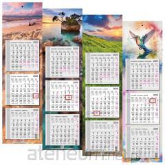 Kalendarz ścienny, trzymiesięczny z okienkiem; 12 kart. 2 wzory główek. Wymiary po rozłożeniu 310x710 mm.