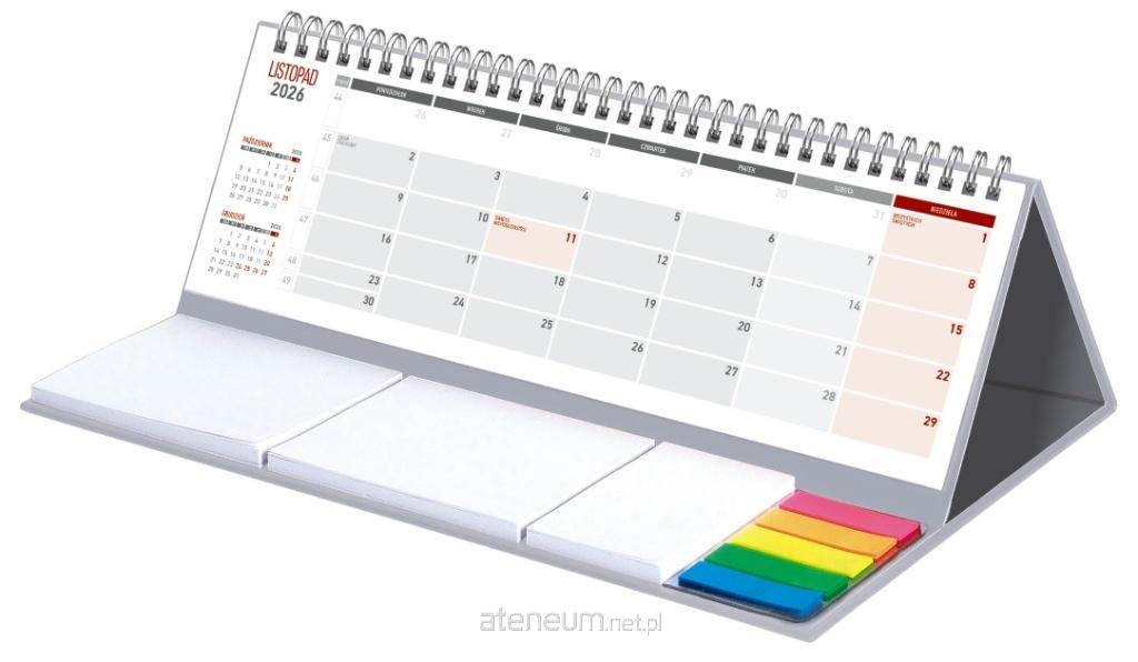 Praktyczny kalendarz szkolny na biurko z przejrzystym kalendarium w układzie trzymiesięcznym. Poręczne samoprzylepne karteczki do notowania.