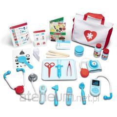 Zestaw w walizce transparentnej zawiera podstawowe, niezbędne wyposażenie każdego medyka. Tylna ścianka walizeczki jest koloru czerwonego, natomiast przód jest transparenty przez co widać wszystko co znajduje się na wyposażeniu małego medyka. Walizka wykonana jest z bardzo trwałego tworzywa, posiada wygodny uchwyt do noszenia oraz żółty klips, który zabezpiecza ją przed otwieraniem się. Ten niewielki zestaw zawiera aż 13 elementów. Wszystkie są oczywiście bezpieczne dla dzieci i proste w użyciu. W walizeczce znajdują się czerwono-granatowy plastikowy stetoskop, nożyczki plastikowe, szczypce, strzykawka, termometr, otoskop, młoteczek, plaster, penseta i notatnik. Wszystkie elementy są oczywiście bezpieczne dla dzieci i proste w użyciu. Seria zestawów i akcesoriów lekarskich z jednej strony służy zabawie w doktora czy pielęgniarkę, a z drugiej strony pomaga dzieciom oswoić się z tematem wizyty u lekarza, wykonywanych badań i zabiegów. Mamy tutaj szeroki wybór zestawów z większą lub mniejszą ilością akcesoriów oraz szereg pojedynczych produktów jak np. fartuchy lekarskie czy stetoskopy. Cała seria wizualnie stworzona jest tak, aby mogli się nią bawić zarówno chłopcy jak i dziewczynki.