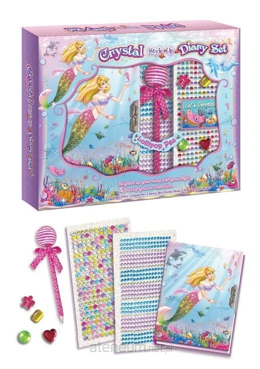 Zestaw zawiera: - mini pamiętnik z kolorowymi kartkami zamykany na zamek - długopis w kształcie lizaka - 4 duże kryształki w różnych kształtach i kolorach - mini zestaw naklejek - 2 arkusze malutkich kolorowych kryształków do wyklejania Wiek: 6+
