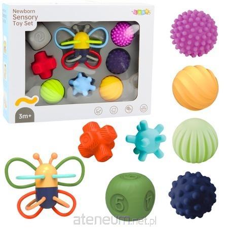 ZESTAW MIĘKKICH PIŁEK SENSORYCZNYCH DLA NIEMOWLĄT Zestaw sensoryczny dla niemowląt to starannie zaprojektowany komplet zabawek wspierających rozwój dziecka już od 3. miesiąca życia. Zestaw został opracowany z myślą o potrzebach najmłodszych dzieci, dla których świat to przede wszystkim bodźce zmysłowe. Składa się z różnorodnych, kolorowych elementów o zróżnicowanej fakturze, kształcie i funkcjach - wszystkie zaprojektowane w celu stymulacji dotyku, wzroku oraz koordynacji oko-ręka. Zabawki pomagają w nauce chwytania, odkrywaniu nowych powierzchni i kształtów oraz wspierają rozwój motoryki małej i sensorycznej integracji. W zestawie znajdują się miękkie piłeczki z wypustkami, elastyczne gryzaki o ciekawych formach, elementy do ściskania i zgniatania, a także grzechotka o lekkiej i poręcznej konstrukcji, która przyciąga uwagę dziecka dźwiękiem oraz kształtem. Wszystkie komponenty zostały wykonane z wysokiej jakości, nietoksycznych materiałów bezpiecznych dla dzieci - odpowiednich do gryzienia, uciskania i eksplorowania ustami oraz rączkami. Powierzchnie są przyjazne dla skóry, a wielkość elementów idealnie dopasowana do dłoni malucha. Zestaw jest idealny zarówno do codziennej, swobodnej zabawy w domu, jak i jako narzędzie wspomagające rozwój niemowląt w żłobkach, przedszkolach oraz w gabinetach fizjoterapii i terapii SI. Świetnie sprawdza się także jako wsparcie przy ząbkowaniu, dając dziecku bezpieczny sposób na ukojenie swędzących dziąseł. SPECYFIKACJA: Materiał: tworzywo bezpieczne dla dzieci (BPA free) Kolor: wielokolorowy Wymiary opakowania: 38 x 29 x 8 cm ZAWARTOŚĆ ZESTAWU: 8x Zabawki sensoryczne o różnych kształtach i fakturach