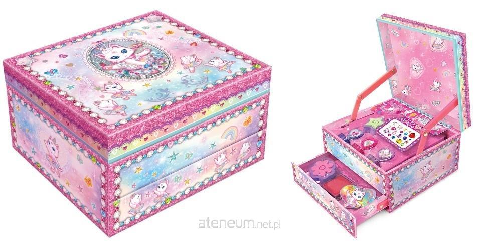Zestaw zawiera: - 3 pieczątki w różnych kształtach - pojemnik z tuszem - kryształki do wyklejania - naklejki do ozdabiania Zapakowany w ozdobne pudełeczko-szkatułkę z samootwierającą się szufladką. Wystarczy podnieść wieczko, a szufladka sama się wysunie.