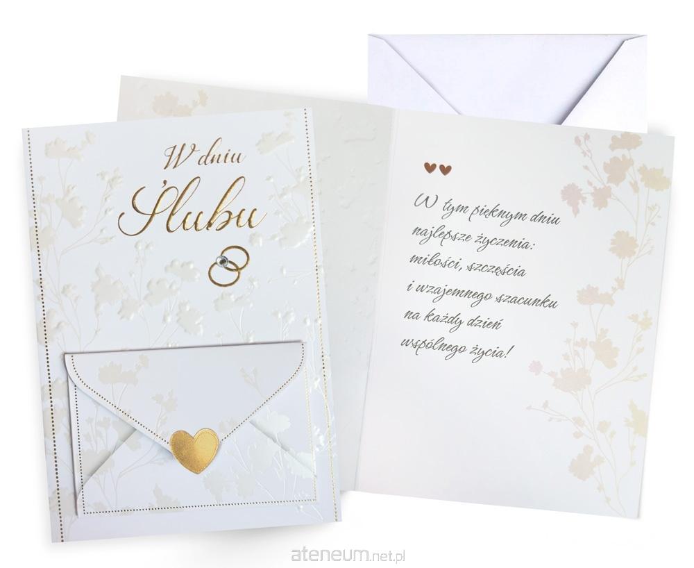 Kartka Dream Cards "W dniu ślubu" DK-1316 Kartka B6 z ozdobnej serii Dream Cards - nieduża, ale robi wrażenie dzięki atrakcyjnej kolorystyce i ciekawym zdobieniom. To idealny wybór łączący przyjazną cenę z jakością. Cechy szczególne: wielkość: B6, 16.6 x 11.7 cm po złożeniu, koperta: w zestawie, kolorowa, zdobienia: kolorowe, różnorodne, bogate (w zależności od wzoru: przyklejane dekoracje, elementy biżuteryjne, odstawniki, metaliczne folie, tłoczenia itp.), okazja: Ślub