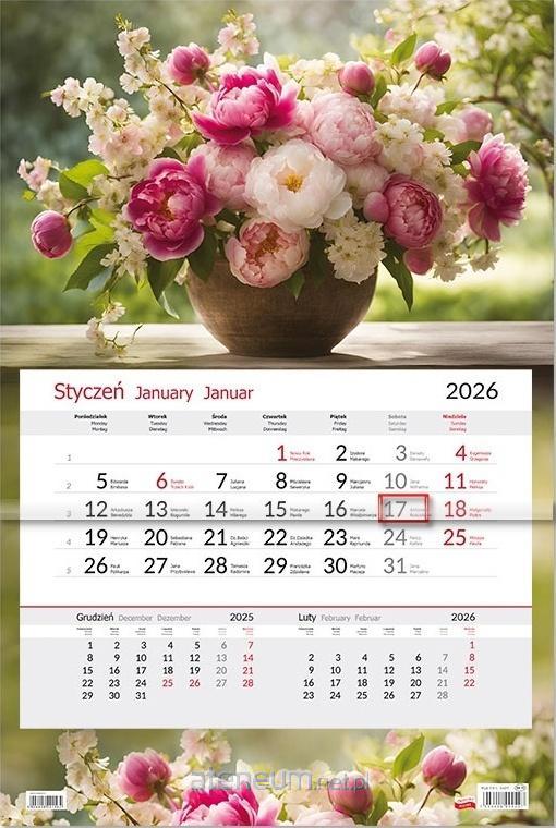 Kalendarium: w języku polskim, angielskim, niemieckim, podwójne imieniny, numeracja tygodni, pasek z okienkiem