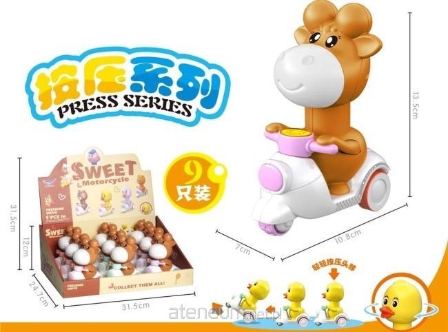 Przedstawiamy słodkiego jelenia na motorze z serii PRESS SERIES - wystarczy nacisnąć, a zabawka sama ruszy do przodu! Każdy jeleń ma uroczy wygląd i solidne wykonanie, zapewniając długie godziny świetnej zabawy. Zbiorcze opakowanie zawiera 9 sztuk, idealnych do sprzedaży detalicznej, prezentów urodzinowych lub jako upominki dla dzieci. Kolorowa ekspozycja i kompaktowe wymiary sprawiają, że zestaw świetnie prezentuje się w każdym sklepie.