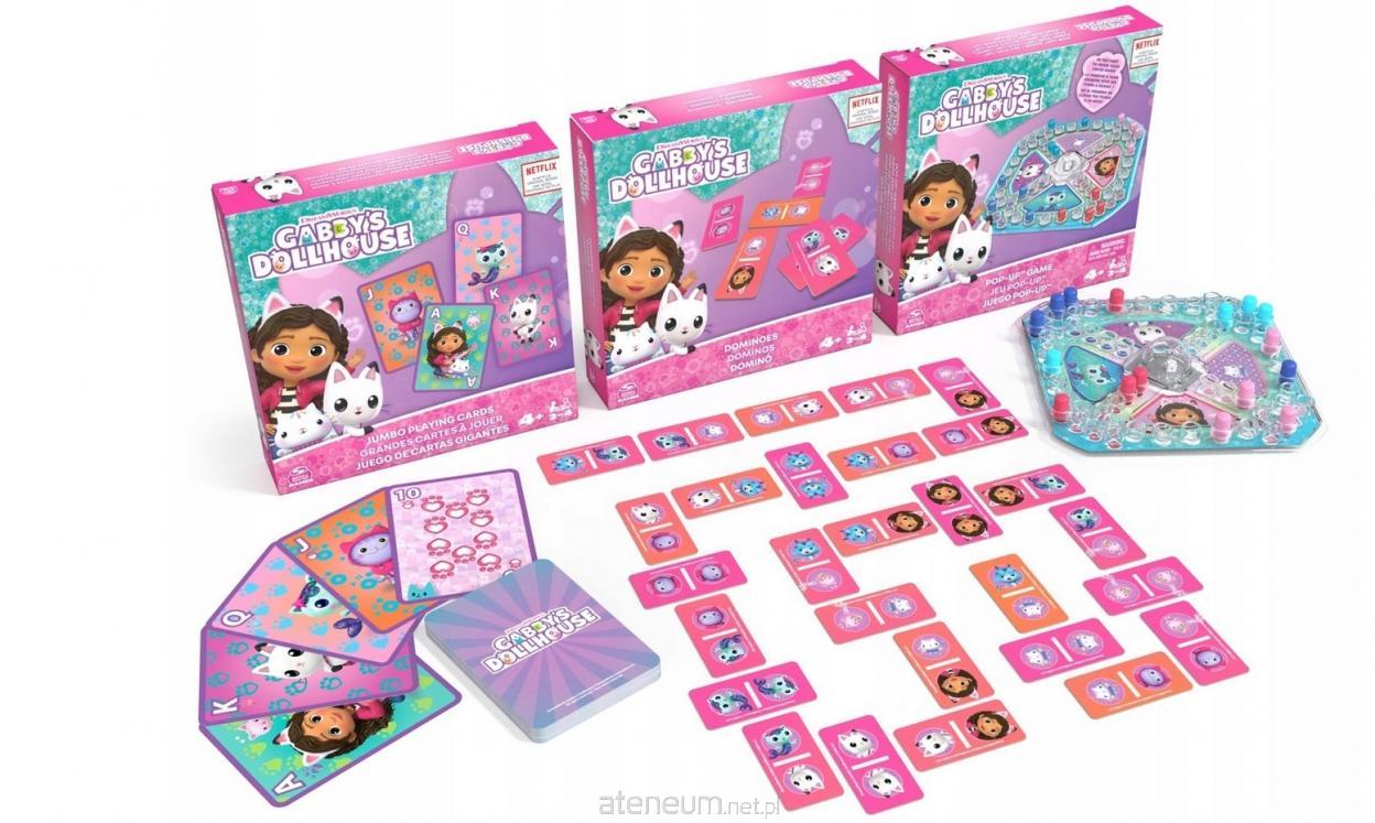 Zestaw Koci Domek Gabi 3 Gry od Spin Master Games, oparty na niezwykle popularnym serialu Netflix DreamWorks, zawiera 3 gry w jednej. Po pierwsze, otrzymujesz Grę Pop Up. W tej grze dla dzieci w wieku 4-8 lat, naciskaj i graj, aby zostać zwycięzcą. Bądź pierwszym graczem, który przesunie wszystkie 4 swoje pionki wokół planszy i dotrze do mety. Uważaj - inny gracz może strącić twój pionek z planszy. Przeznaczona dla 2-4 graczy, prosta i edukacyjna gra planszowa dla dzieci. Bądź pierwszy graczem, który doprowadzi swoje pionki do bazy w tej łatwej grze z popperem, idealnej na rodzinny wieczór z grami. Otrzymasz również 28-elementowy zestaw domino i talię kart jumbo, zawierającą też jokery. Te klasyczne gry planszowe dla dzieci są idealne na przyjęcie w Kocim Domku Gabi. Te gry dla dziewczynek i chłopców zawierają wszystkie ulubione postacie Gabi, w tym DJa Kocimiętkę i Łakotka. Jeśli Twoje dzieci nigdy nie mają dość zabawek z serii Koci Domek Gabi, wypróbuj te ciekawe gry. Niezależnie od tego, czy szukasz prezentów dla 6-letnich dziewczynek, czy gier rodzinnych, te 3 zabawne gry będą idealnym prezentem na urodziny lub specjalne okazje. Ten zestaw gier planszowych dla dzieci w wieku 4-6 lat jest przeznaczony dla przedszkolaków, ale spodoba się też graczom w wieku od 4 lat. Włącz odcinek serialu Koci Domek Gabi, wyjmij swój zestaw gier i spędź ekscytującą noc na rodzinnej zabawie.