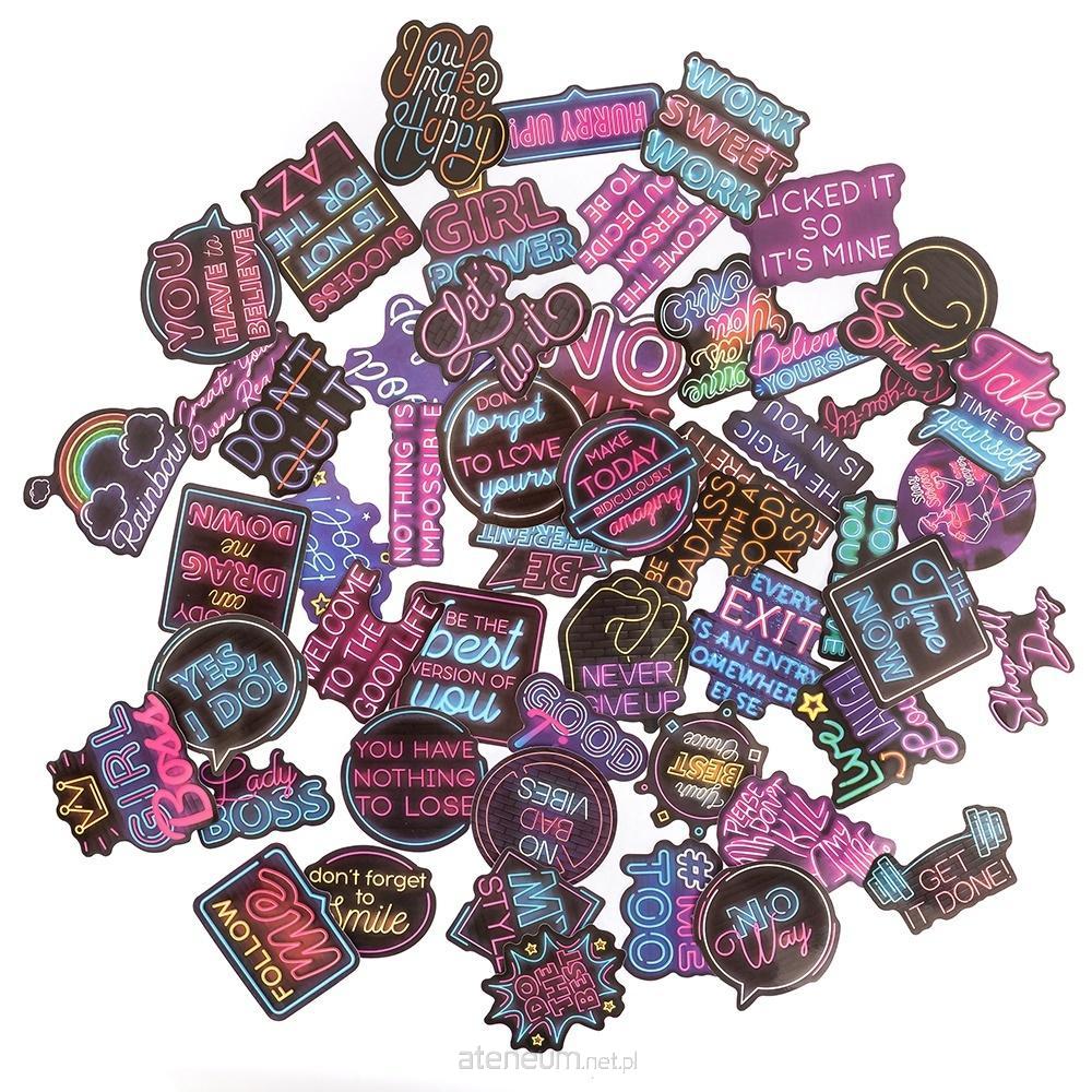 Winylowe naklejki z motywacyjnymi sloganami utrzymanymi w intensywnych, ciemnych kolorach, w połączeniu z czernią, z grafiką nawiązującą do motywu neonów świetlnych.