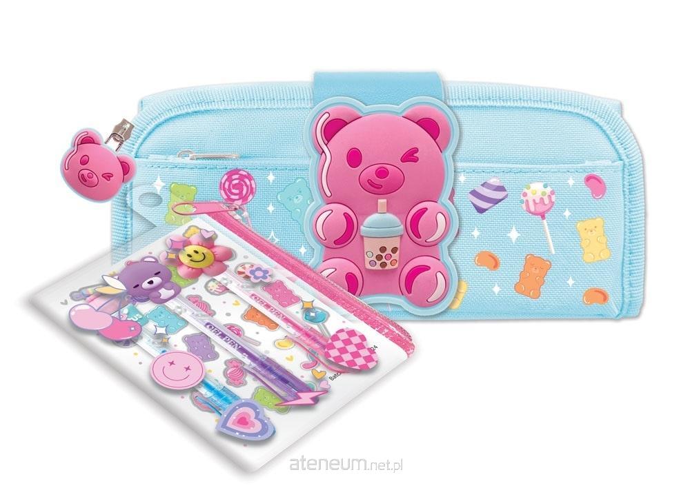 Rozkładany piórnik na przybory szkolne. Wiele przegródek i miejsca na drobiazgi, zamykany na rzep z ozdobą. Do piórnika dołączona jest przezroczysta saszetka zamykana na zamek z 3 mini długopisami żelowymi. Wiek: 5+