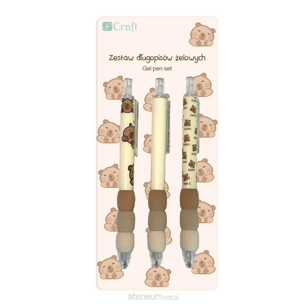 Zestaw 3 żelowych długopisów z motywem kapibary, w kolorze czarnym. Gładko piszące, idealne do szkoły, biura i codziennego użytku. Stylowe i wygodne w trzymaniu.