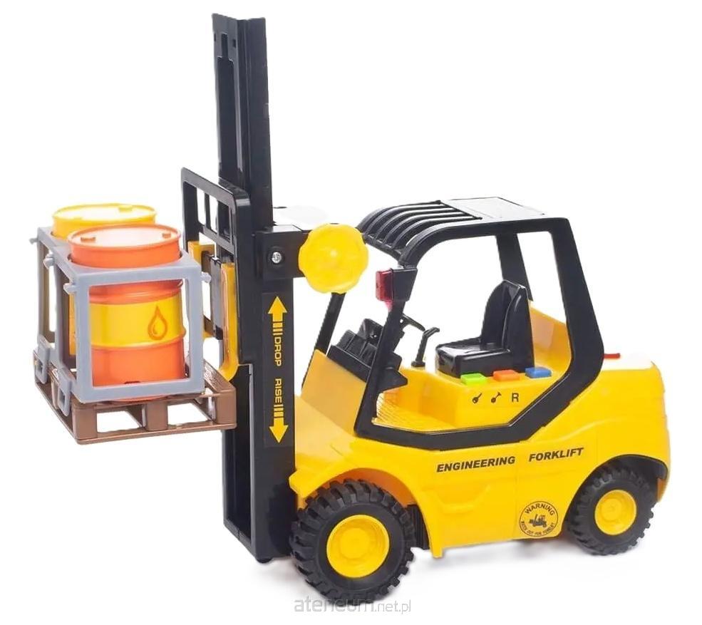 Wyjątkowy pojazd, który nie może zostać pominięty w domowym parku maszyn i zabawek. W zestawie z Wózkiem widłowym znajdziesz dodatkowe akcesoria: paletę oraz dwie beczki z obręczami ułatwiającymi przewożenie. Prezentowany pojazd jest wyposażony w efekty dźwiękowe i świetlne. W każdym magazynie wózek widłowy ułatwiający przewóz produktów jest koniecznością. Ten kompletny zestaw jest wykonany w całości z tworzywa sztucznego i zawiera ruchome elementy, dzięki czemu zabawa staje się jeszcze ciekawsza. Wózek widłowy posiada napęd i osadzony jest na czterech kołach wykonanych z gumy. . Za pomocą prostego ruchu ręki na gładkich powierzchniach dziecko może przyspieszyć pojazd i wprawić go w ruch. Konstrukcja pojazdu jest lekka i pozbawiona ostrych krawędzi, dzięki czemu Twoje dziecko nie zrobi sobie krzywdy. Kolorystyka pojazdu przyciąga wzrok, a efekty świetlne i dźwiękowe zwiększają realizm zabawki. Ciężarówka wydaje realistyczne dźwięki klaksonu, pracy silnika i cofania. Pomimo niewielkich rozmiarów zabawka może poszczycić się bogactwem szczegółów, wzbogacających zabawę.