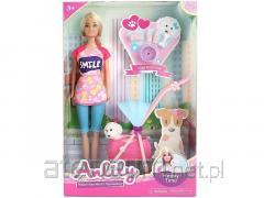 Lalka z pieskiem w wózku z akcesoriami dla psa