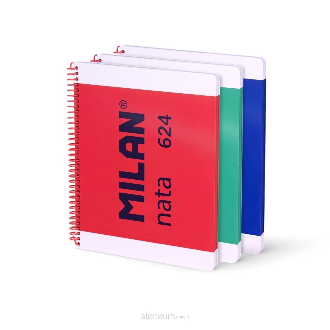 Zestaw 3 zeszytów notesów z metalową spiralą z zamknięciem w systemie coil-lock zapobiegającym zaczepianiu się o odzież lub zarysowaniom mebli. Papier A4 w kratkę (5 x 5 mm), 80 kartek. Kolory: niebieski, zielony i różowy. Sztywna kartonowa okładka w dwóch różnych wykończeniach - błyszczącym i matowym. Wysokiej jakości papier o gramaturze 95 gr/m2, z mikroperforacją oraz z 4 otworami. Rozcięcie przy perforacji ułatwiające rozdzelenie każdego arkusza. Kolekcja MILAN nata® 624 inspirowana jest oryginalną kolorystyką i designem gumek MILAN produkowanych w Hiszpanii od 1918 roku.