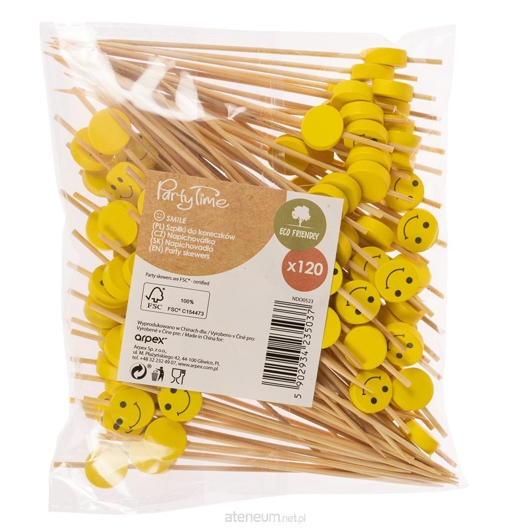 Wykałaczki zakończone dekoracyjnymi kształtami ze wzorem uśmiechniętej buzi. Idealne do koreczków wytrawnych jak i słodkich, jako dekoracja ciast, muffinów, owoców. Dekoracyjne wykończenie patyczków nadaje potrawom ciekawego wyglądu. Produkt posiada certyfikat FSC®, co oznacza, że surowce wykorzystane do jego produkcji zostały pozyskane w zgodzie z odpowiedzialnym i legalnym korzystaniem ze światowych zasobów leśnych. W opakowaniu znajduje się 120 sztuk. Szpilki o długości 12 cm.