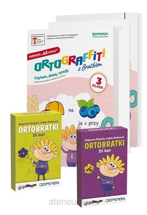 Ortograffiti z Bratkiem. Wersja 45 minut. Klasa 3. Komplet z kartami pracy, Ortobratkami i teczką W skład zestawu trzecioklasisty wchodzą: Zeszyt z ćwiczeniami do nauki czytania i pisania Karty pracy Dwa zestawy kart do gry Ortobratki Teczka do przechowywania materiałów