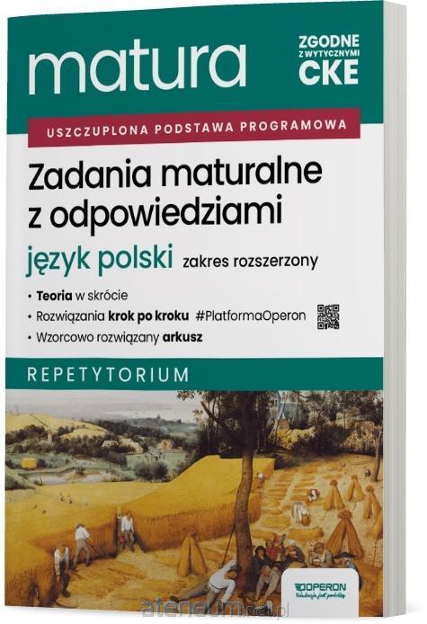"Publikacja aktualna z wymaganiami CKE, opracowana przez organizatora największych, ogólnopolskich próbnych matur w Polsce. Jedna książka, w której znajdziesz to, co niezbędne, aby zdać maturę zjęzyka polskiego na poziomie rozszerzonym. Publikacja została przygotowana zgodnie z informacjami opublikowanymi przez CKE na dzień 31 lipca. Dlatego zaprezentowany w niej arkusz egzaminacyjny obejmuje część testową i wypracowanie. Zgodnie z informatorem CKE z 28 sierpnia 2024 r. w arkuszu z języka polskiego PR będzie tylko wypracowanie. W związku z tym część testową zaprezentowaną w publikacji można wykorzystać w ramach ćwiczeń. Są to zadania typu egzaminacyjnego, których przećwiczenie przyda się w przygotowaniach do matury na poziomie podstawowym czy na studia. Publikacja"Zadania maturalne z odpowiedziami": pozwala utrwalić wiedzę i umiejętności przydatne na maturze z języka polskiego; pozwala rozwijać technikę tworzenia wypowiedzi pisemnych wymaganych na egzaminie; umożliwia śledzenie postępów oraz stopnia przygotowania do matury z języka polskiego; skutecznie przygotowuje do zdania egzaminu z języka polskiego. Publikacja"Zadania maturalne z odpowiedziami"składa się z przykładowych zadań opracowanych do matury ustnej, wypracowań wraz z konspektami odpowiedzi, krótszych i dłuższych zadań do samodzielnego rozwiązania w ramach powtórek (wraz z odpowiedziami) oraz rozwiązanego arkusza maturalnego. Dodatkowym wsparciem w przygotowaniach do matury są również publikacje"Teoria do matury", czyli książka zwierająca pełną wiedzę podręcznikową ze wszystkich lat nauki, oraz"Arkusze maturalne", zapewniające praktyczne ćwiczenia i zapoznanie się z formułą egzaminu. Istnieje również możliwość zaopatrzenia się w cały Pakiet maturalny.Możesz także skorzystać z Platformy Operon dla ucznia. Przedmiot:język polski Zakres:rozszerzony Autorzy: Urszula Jagiełło, Renata Janicka-Szyszko, Aleksandra Marzec Liczba stron:124 Działy: Matura ustna 1.1. Zagadnienia z listy jawnych zadań 1.2. Zagadnienia związane z literaturą, ze sztuką lub z językiem Wypracowania Testy historyczno-literackie Wzorcowo rozwiązany arkusz maturalny Odpowiedzi do zadań"