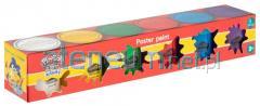 Farby plakatowe 24 kolorów. 12 kolorów podstawowych, 4 kolory brokatowe (zielony, niebieski, fioletowy, czerwony), 4 kolory metalizowane (złoty, srebrny, różowy, niebieski), 4 kolory neonowe (różowy, zielony, żółty, pomarańczowy). Pojemność 20 ml. Farby na bazie wody o intensywnych kolorach. Znakomitą przyczepność pozwala na malowanie takich podłoży jak: papier, karton, drewno, ceramika, kamień. Wymalowane powierzchnie po wyschnięciu są matowe o intensywnych barwach, odporne na działanie światła i ścieranie. Wyprodukowane w Polsce.