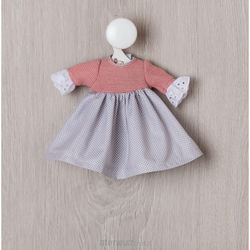 Każda miłośniczka popularnych hiszpańskich lalek "przyjaciółek" z serii ASI Celia z pewnością zachwyci się modną, ręcznie szytą sukienką z rozkloszowanym dołem. Góra kreacji została wykonana z przyjemnej w dotyku dzianiny w pięknym odcieniu różu. Z kolei dół tworzy miękka jasnoszara bawełna w delikatne białe kropeczki. Rękawki wykończono białą, haftowaną tkaniną. Łatwa w zakładaniu i zdejmowaniu sukienka jest zapinana z tyłu na rzep.