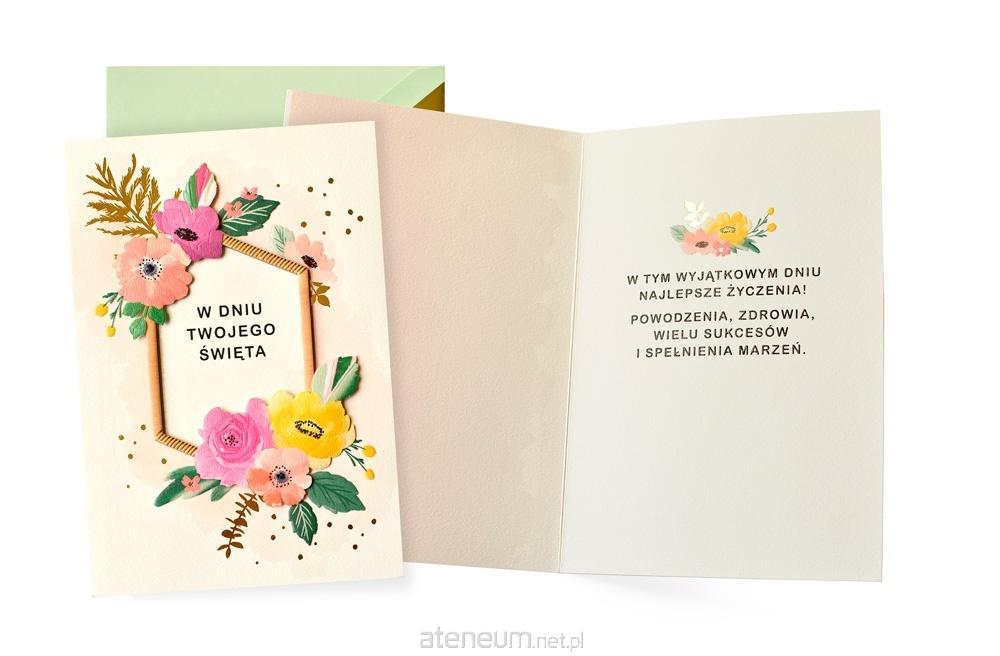 Karnet SCH-013 "W dniu Twojego święta" Kartka B6 z ozdobnej serii Signature Cards - nieduża, ale robi wrażenie dzięki atrakcyjnej kolorystyce i ciekawym zdobieniom. Cechy szczególne: wielkość: B6, 16.6 x 11.7 cm po złożeniu, koperta: dopasowana w zestawie, zdobiona metaliczną folią zdobienia: kolorowe, różnorodne, bogate (w zależności od wzoru: przyklejane przestrzenne dekoracje, metaliczne folie, tłoczenia itp.), okazja: ogólne życzenia, urodziny