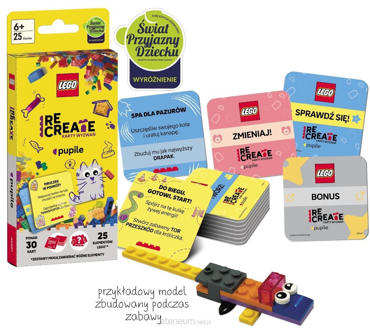 "Uwielbiasz świat LEGO® i nie boisz się wyzwań? Ten zestaw jest właśnie dla ciebie! Losuj karty, dobieraj klocki i twórz niepowtarzalne modele związane ze szkołą. Daj się ponieść swojej kreatywności! Plecak na nowy rok szkolny albo piórnik, klasowy zwierzak, a może nauczyciel kieszonkowy? To tylko niektóre z konstrukcyjnych zadań, jakie cię czekają w tej rozgrywce. Uwaga! Właśnie wkraczasz do świata nieskończonych możliwości budowania i przebudowywania! W zestawie znajdziesz 4 typy kart: karty TWÓRZ! inspirują do budowania, karty SPRAWDŹ SIĘ! wprowadzają kolejne konstrukcyjne wyzwania, karty ZMIENIAJ! dodają kontekst i zachęcają do przebudowywania, a karta BONUS nada zupełnie nowy wymiar zabawie! Karty Wyzwań świetnie się sprawdzą w podróży. Można się nimi bawić samemu lub z przyjaciółmi. Zestaw zawiera: 32 karty 25 klocków LEGO® W serii LEGO® Recreate. Karty Wyzwań znajdziemy także inne tytuły: Zwierzęta, Kosmos, Zamek, Przygody ninja, Przygoda w mieście, Ocean, Wynalazki, Pupile, Urodziny, Natura."
