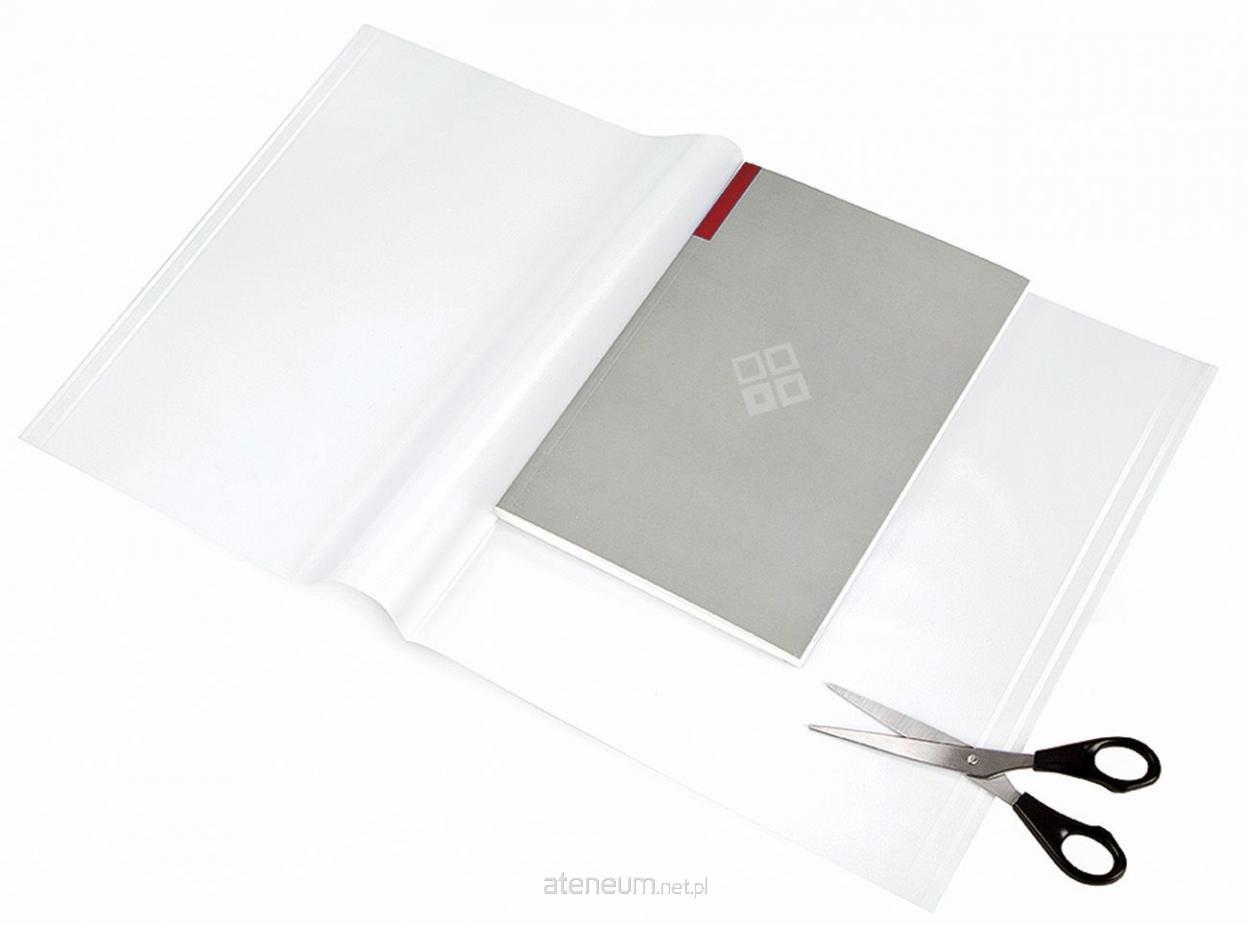 Okładka na zeszyt lub książkę do formatu A4, wykonana z polipropylenu, bezbarwna, przezroczysta, na bokach paski taśmy samoprzylepnej, przycinana na potrzebną wysokość. Pakowana po 5 sztuk.