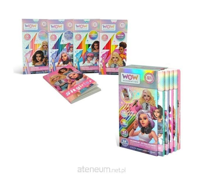 Zawartość zestawu: 12 pastelowych kolorów kredek, 12 klasycznych kolorów kredek, 12 neonowych kolorów kredek, 12 metalicznych kolorów kredek, 1 zeszyt z czystymi kartkami.