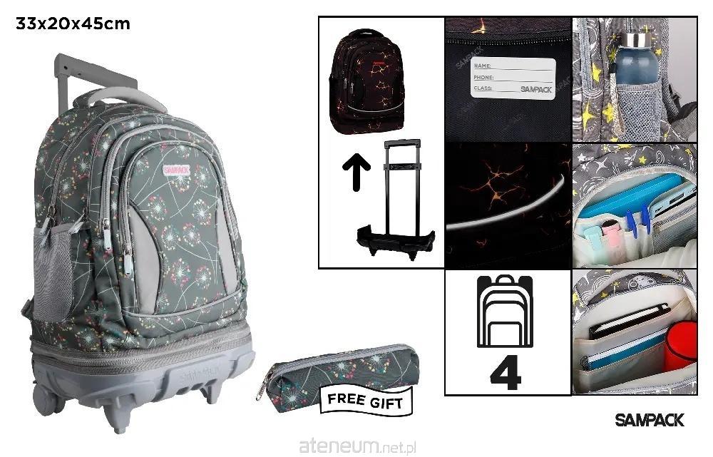 Plecak ze stelażem i kółkami grafitowy dmuchawce czterokomorowy 33x20x45cm, piórnik w zestawie