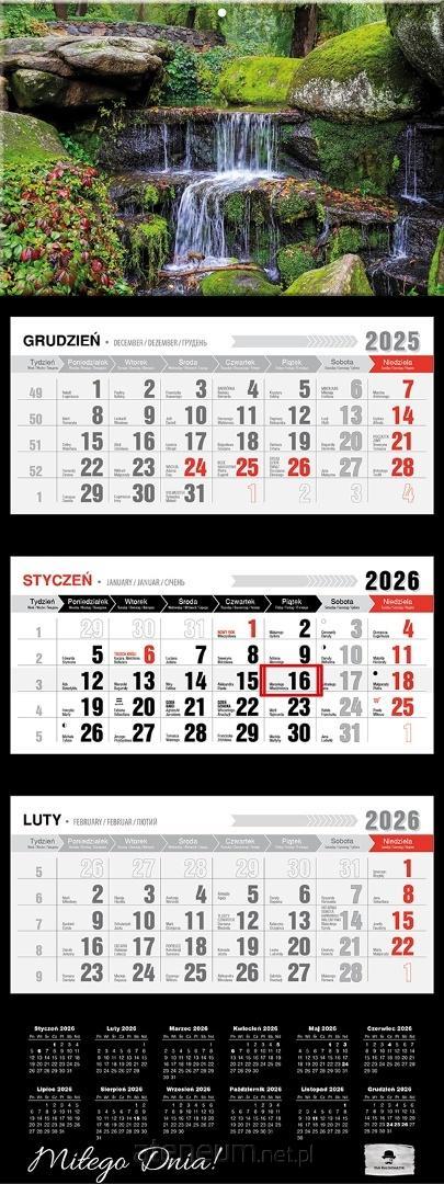 Kalendarz Trójdzielny PREMIUM Z WYPUKŁĄ GŁÓWKĄ. Format 315/810mm. Trzy komplety klasycznych kalendariów z przesuwnym okienkiem. Główka z otworem wierconym. Dodatkowo nazwy miesiąca i dni tygodnia w języku Ukraińskim, Angielskim i Niemieckim. Kalendarium dodatkowo zawiera fazy księżyca i znaki zodiaku. Dużo miejsca do notowania, czytelne duże litery i cyfry. DODATKOWO PRZEDŁUŻONE PLECKI KOLOREM DOPASOWANE DO WZORU ZE SKRÓCONYM KALENDARIUM NA ROK 2025.