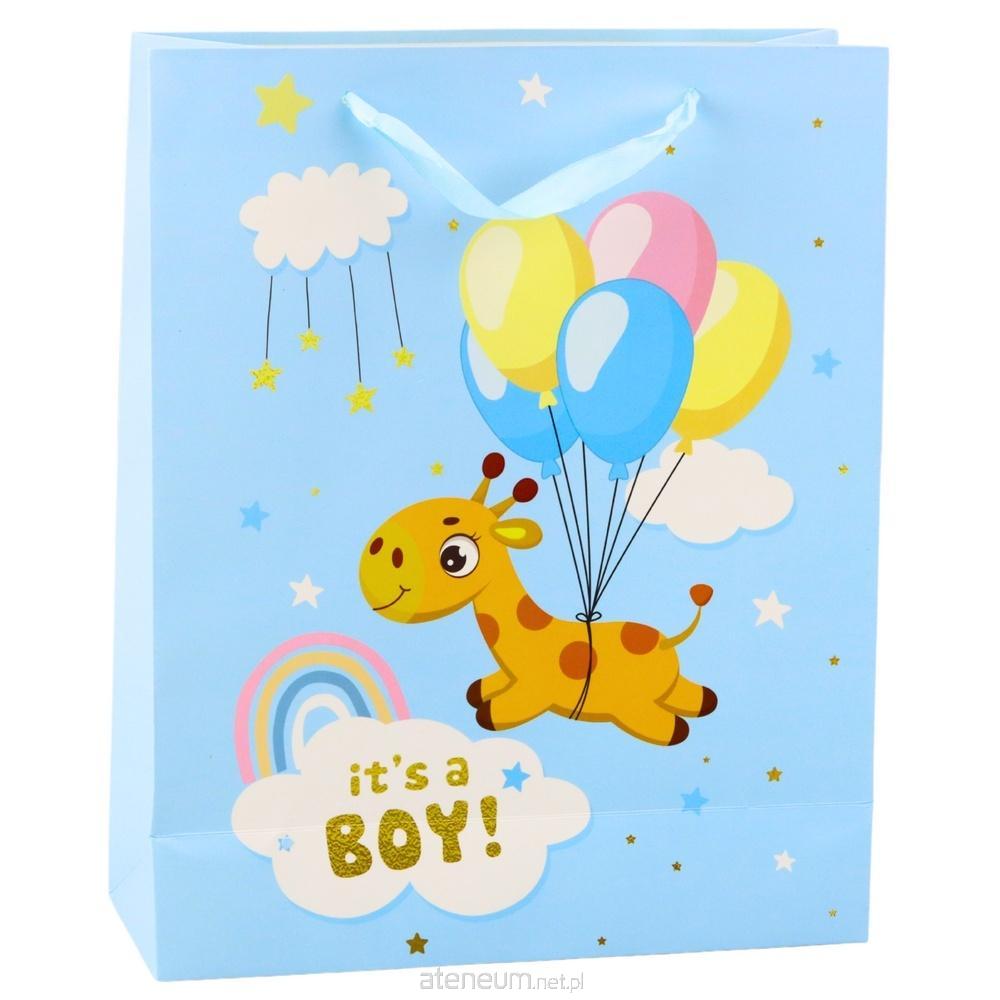 Urocza torba prezentowa w błękitnym kolorze z połyskującym napisem "It's a BOY!" to doskonały wybór do eleganckiego zapakowania prezentu z okazji narodzin chłopca, baby shower lub pierwszych urodzin malucha. Na froncie torby widnieje wesoła żyrafka unosząca się na kolorowych balonach, otoczona uroczymi elementami graficznymi - chmurkami, gwiazdkami, tęczą i drobnymi ozdobami, które razem tworzą ciepły, dziecięcy klimat, pełen radości i pozytywnych emocji.