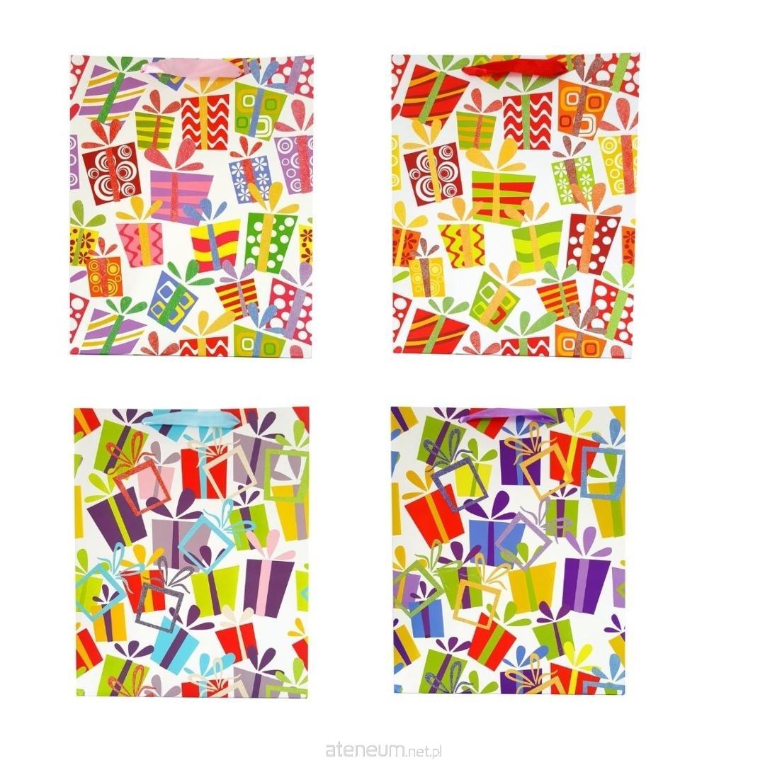 Uniwersalna torebka prezentowa z wzorem kolorowych prezentów (z brokatowymi elementami) wykonana z grubszego papieru o gramaturze 210 g, co zapewnia jej większą trwałość i odporność na obciążenie. Wyposażona w elegancką tasiemkę, który zapewnia wygodny uchwyt i estetyczne wykończenie. To praktyczne opakowanie, które podkreśla wartość wręczanego prezentu.