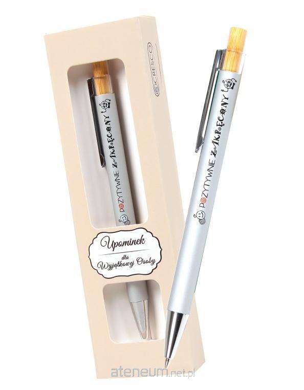 Metalowy, automatyczny długopis DYPLOMAT z nadrukiem Pozytywnie zakręcony - jako prezent na różne okazje dla chłopaka, nie tylko na Dzień Chłopaka. Długopis koloru szarego z wymiennym wkładem typu zenith. Zapakowany w prezentowe etui.
