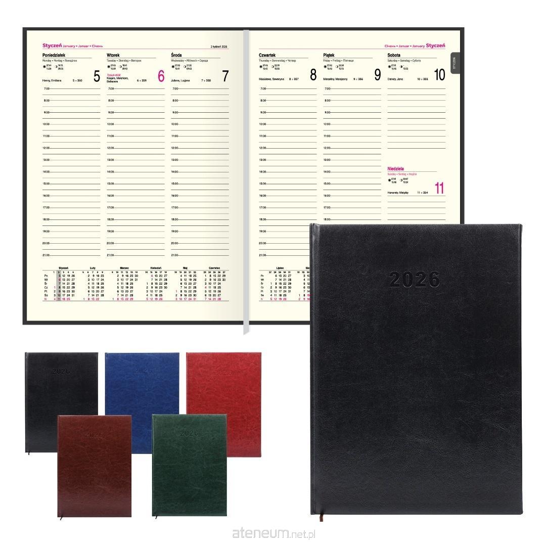 Kalendarz ma 112 strony i twardą, skóropodobną okładkę, która chroni wnętrze przed zniszczeniem, zapewniając jednocześnie elegancki wygląd. Układ środka jest niezwykle funkcjonalny - cały tydzień ma swoją stronę, a cała druga strona jest poświęcona na notatki, co ułatwia organizację i planowanie.