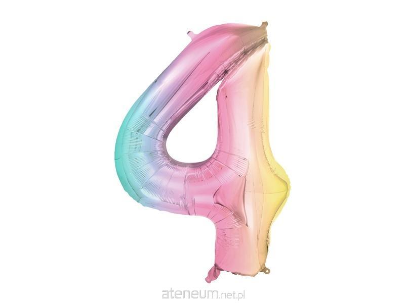 Balon foliowy Cyfra ''4'' w kolorze pastelowym tęczowym , rozmiar przed napompowaniem ok. 100 cm (39''), rozmiar po napompowaniu ok. 86 cm (34''). Do napompowania powietrzem i helem. Zestaw zawiera słomkę.