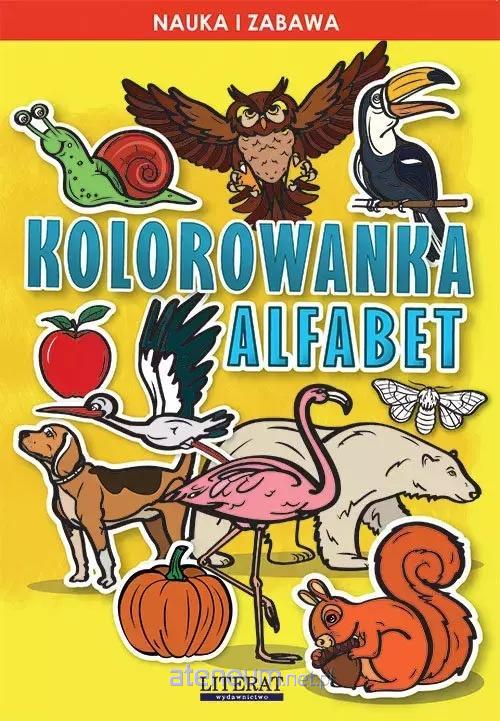Kolorowanka bawi i uczy ? zawiera duże ilustracje, kolejne litery alfabetu polskiego (w tym wersje ?pisane? ze strzałkami wskazującymi kierunek ruchu ręki) i dodatkowo tłumaczenie na język angielski podpisów pod rysunkami.