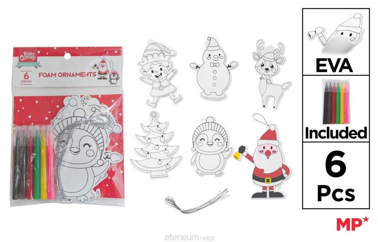 Zestaw ozdób na choinkę do pokolorowania w komplecie z flamastrami (6szt.). Elf, bałwanek, renifer, choinka, pingwinek i Mikołaj. Rozmiar jednej ozdoby: ok. 10x7cm.