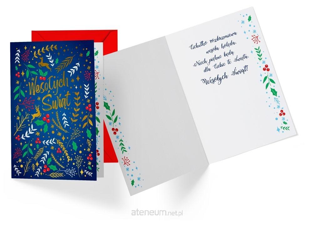 Kartka wielkości B6, zdobiona w zależności od wzoru metaliczną folią lub brokatem. Każda kartka posiada kolorowe życzenia w środku i koperte.