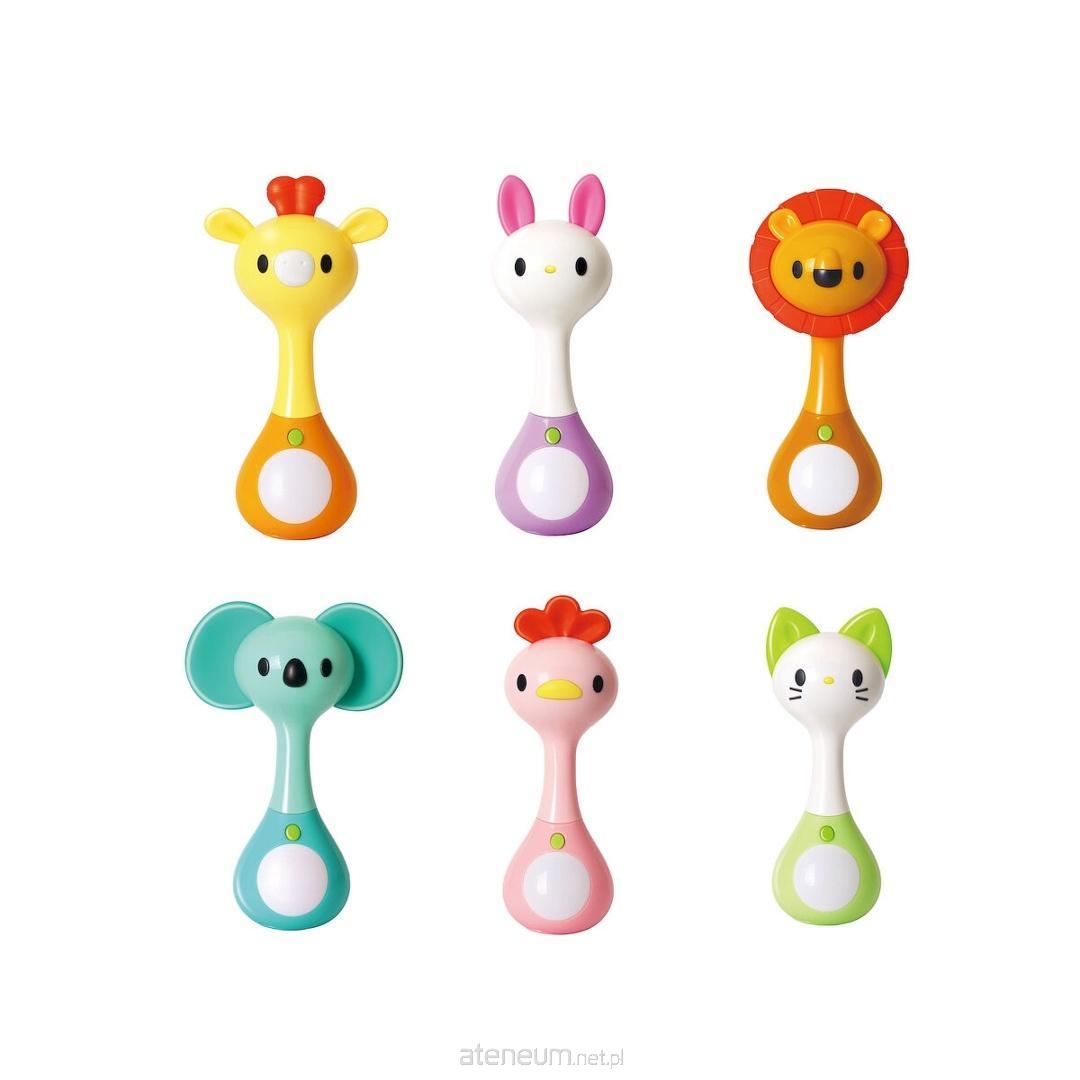 Wiek: 3m+ Interaktywna grzechotka 6 do wyboru: kurka, żyrafka, koala, kotek, lew, króliczek Wyposażona w 3 tryby, które można przełączać przy pomocy przycisku umieszczonego na brzuszku zabawki. Tryb 1 Po włączeniu zabawki odtwarzane są wesołe melodie Podczas grania melodii po potrząśnięciu w dobywają się delikatny dźwięk grzechotania Tryb 2 Przy potrząsaniu grzechotki wydobywają się krótkie dźwięki tj. śpiew ptaków czy śmiech dziecka. Dodatkowo brzuszek króliczka świeci w różnych kolorach Tryb 3 Ponownie odtwarzane są melodie podczas których przy potrząsaniu wydobywają się tony utworu. Odgłosy wydobywające się z grzechotki są przyjemne dla ucha. Tryby zabawy zmienia się guziczkiem umieszczonym na brzuszku zwierzątka. Gdy zabawka nie jest używana przypomina o sobie dźwiękiem.